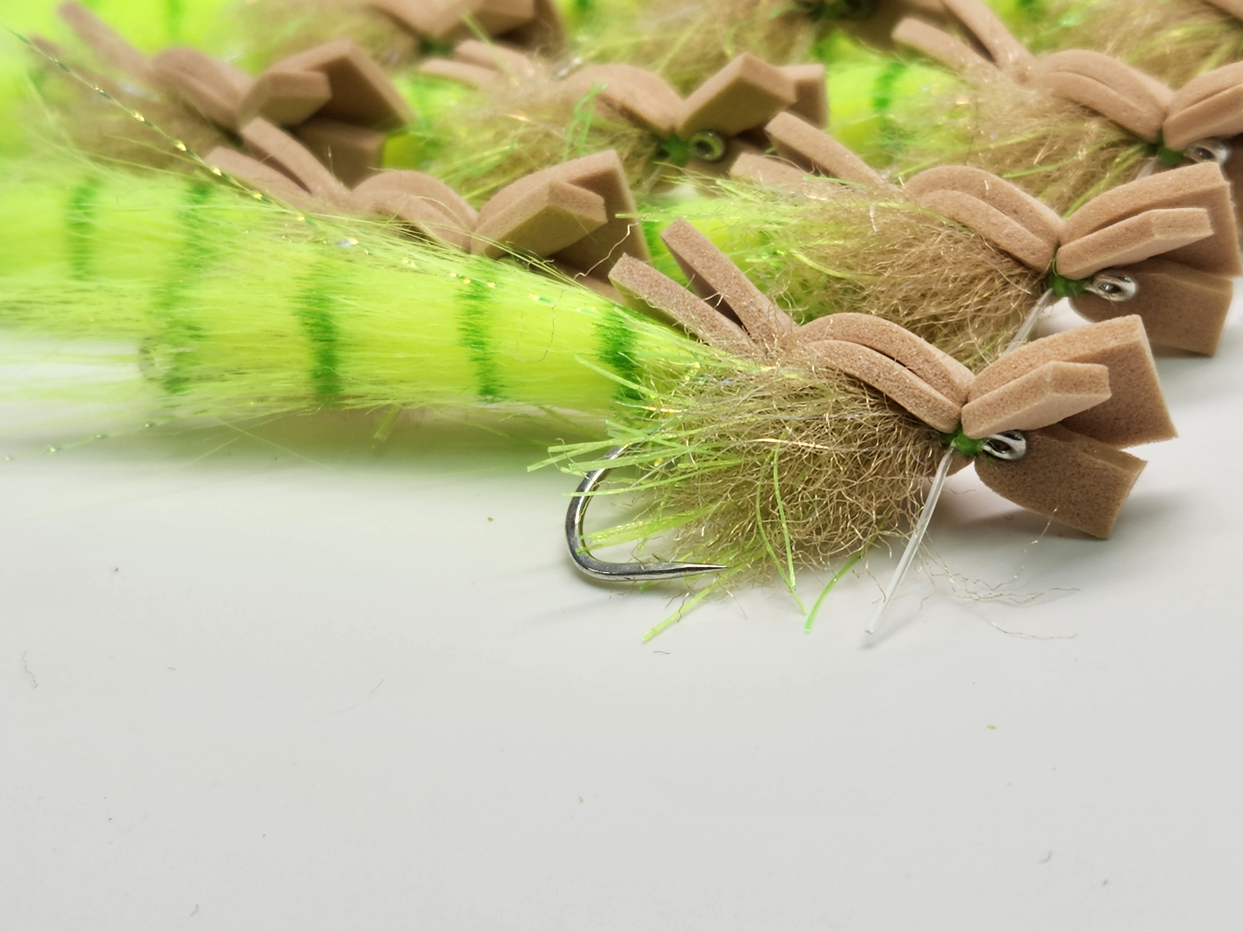 The Bomb Ass Gurgler is a top water fly that is used for any species of fish that takes pray on the surface. Although the Bomb Ass Gurgler is designed as a saltwater fly to catch snook and baby tarpon, this fly has had great success as a fresh water fly when targeting peacock bass and large mouth bass. The tan and orange version was designed to look like a snapping shrimp on the surface, but this fly is simply “buggy” and look like a lot of things that fish want to attack.