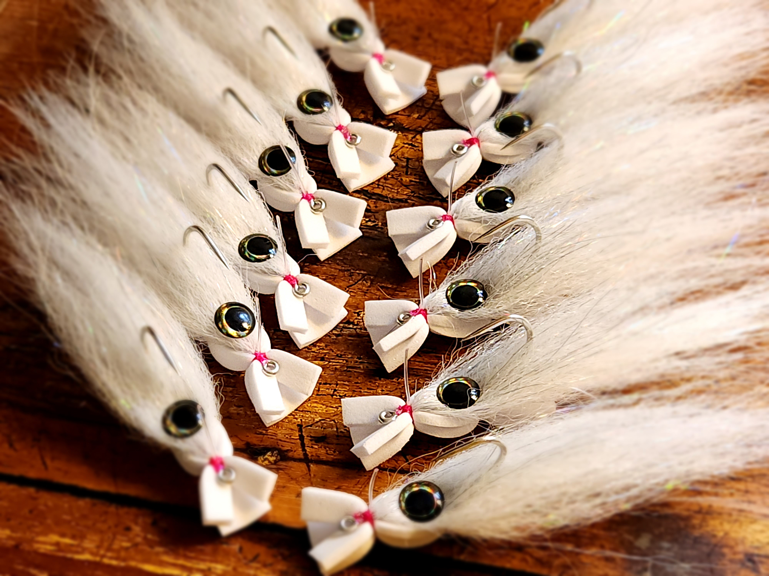 The Cyclopes is designed to chase snook and baby tarpon. The idea was to imitate a dying baitfish on it’s side. Although it was intended for snook and baby tarpon, it works well on speckled trout and largemouth bass too. The Cyclopes is tied just like a Bomb Ass Gurgler, but it’s all white with it’s distinctive single eye on the bottom of the fly. Does that eye really make a difference? Yes it does. I’ve had picky fish come up to this fly and take one last look before slamming it. “Really, Mike?”